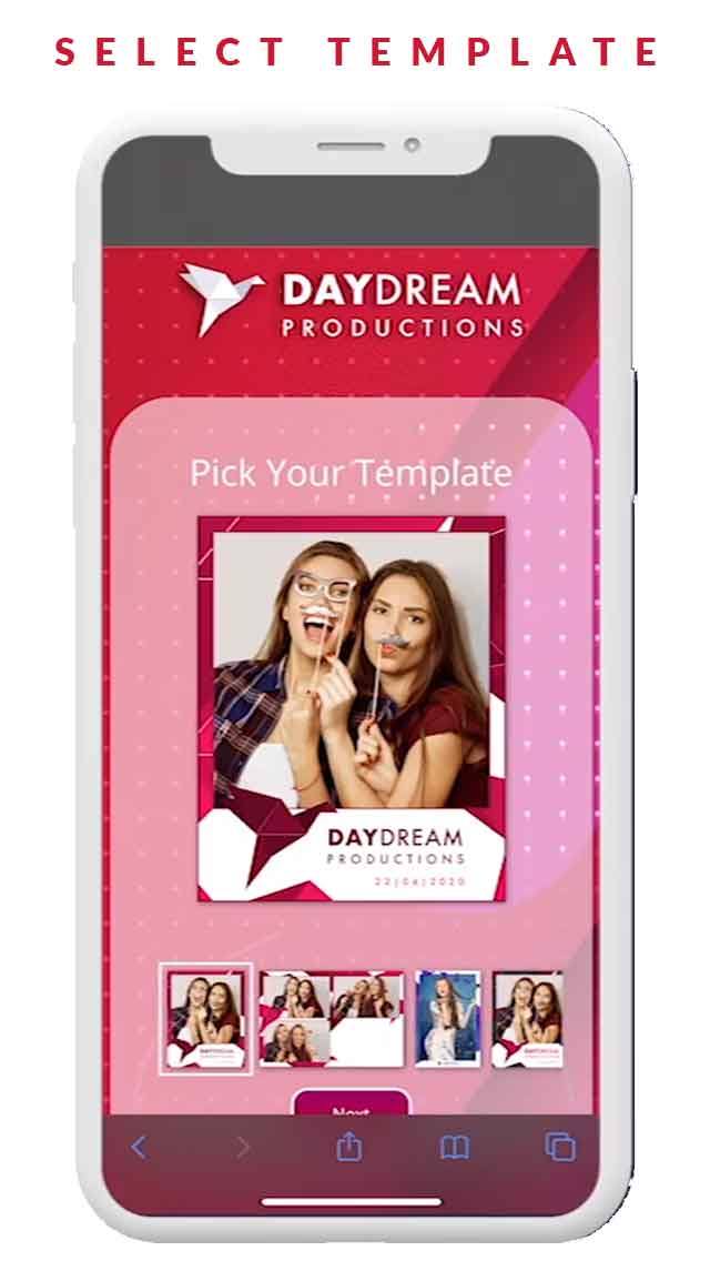 Guest go to the URL, Select photo template, Snap Photo, and Share.