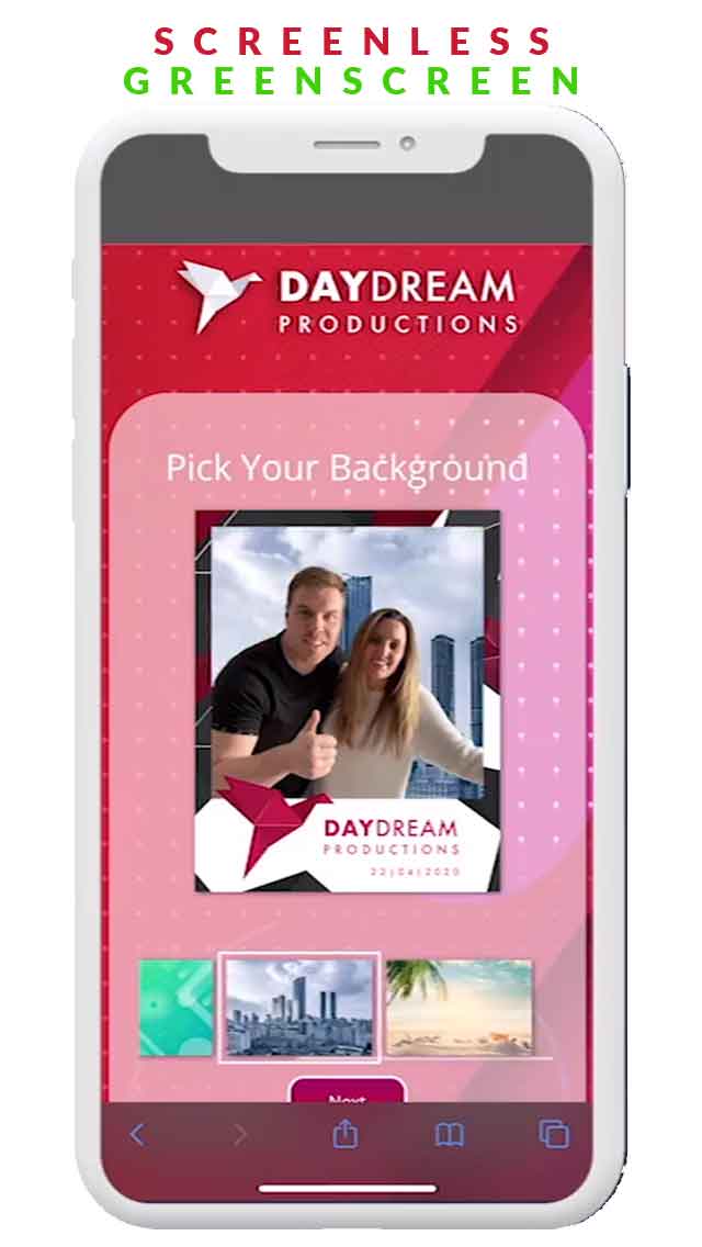 Screenless Greenscreen removed the guests backdrop with AI background removal and can select a new backdrop for their photo. NO GREENSCREEN REQUIRED.