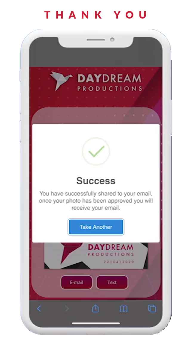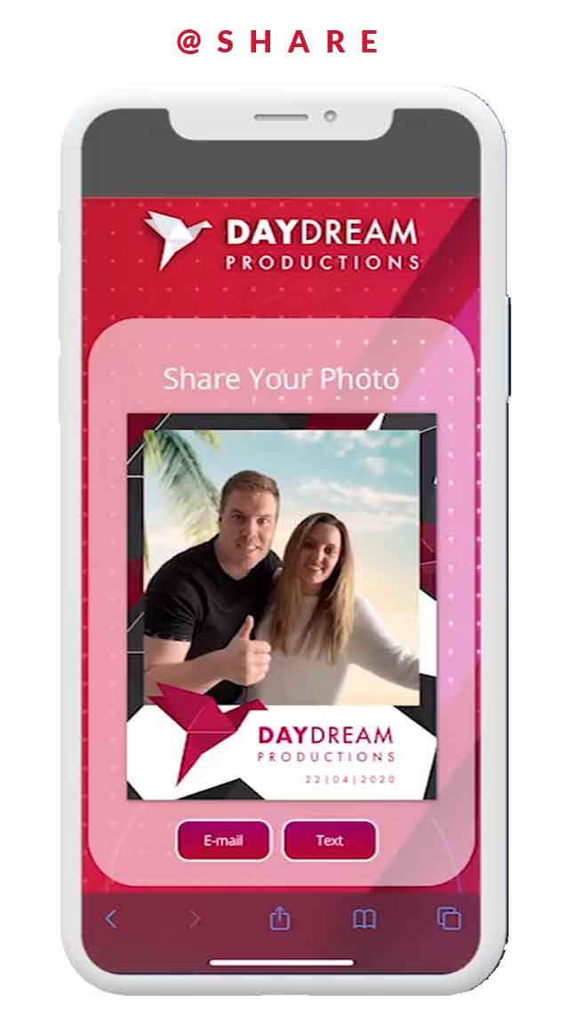 Virtual Photo Booth landing page will feature your Company Logo, CTA, Social Media Links and more.